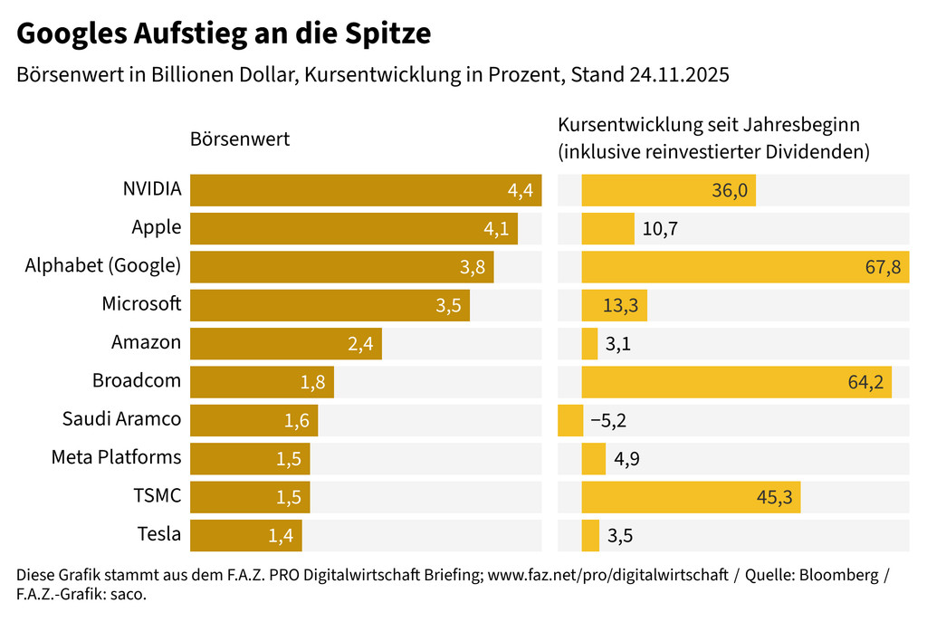 Seitdem hat Google einen der smartesten Strategieschwenks der Geschichte geschafft – und sich in Rekordzeit an die Spitze der KI-Entwicklung gesetzt. Der Lohn: In diesem Zeitraum hat sich der Aktienkurs verdreifacht. In der Liste der wertvollsten Unternehmen der Welt hat die Google-Muttergesellschaft Alphabet dem Konkurrenten Microsoft erstmals nach sieben Jahren überholt. Die Wetten, dass Alphabet schon bald auch Nvidia und Apple an der Spitze ablösen wird, stehen gut.