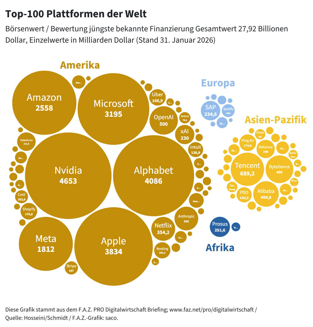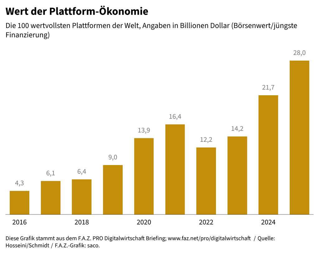 Die KI befeuert die Plattformwelt, deren Wert sich in den vergangenen zwei Jahren verdoppelt hat. Aber sie verschiebt auch die Spielregeln, weil sich KI-Agenten als neue Interaktionsschicht über die Plattformen legen. Wer diese Schicht kontrolliert, kontrolliert nicht mehr nur Aufmerksamkeit, sondern Entscheidung und Ausführung.