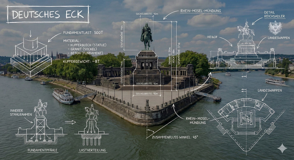 Mit dem passenden Prompt erstellt Google Gemini 3 Pro eine um architektonische Daten ergänzte Darstellung vom Deutschen Eck in Koblenz. Screenshot: Marcus Schwarze, Google Gemini, KI-generiert