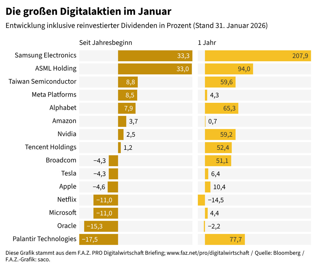 . Das Softwareunternehmen, dessen wichtigster Kunde die US-Regierung ist, hat im vierten Quartal seinen Umsatz um 70 Prozent auf 1,41 Milliarden Dollar gesteigert. Kritik erntet Palantir aktuell wegen der Kooperation mit der Einwanderungsbehörde ICE.