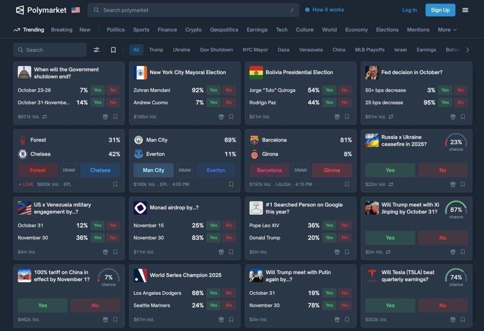 Bei Polymarket investieren Nutzer aus allen Kontinenten Millionen Dollar täglich. Wer gewinnt die Bürgermeisterwahl am 4. November in New York? (Mit 89 Prozent getippter Wahrscheinlichkeit voraussichtlich Zohran Mamdami.) Gibt es bis Jahresende einen Waffenstillstand zwischen Russland und der Ukraine? (Mit nur 19 Prozent Ja-Tippern eher unwahrscheinlich.) Und trifft Trump bis Ende Oktober den chinesischen Machthaber Xi Jinping? (Zuletzt sahen die Polymarket-Teilnehmer dafür eine 80-prozentige Wahrscheinlichkeit.)