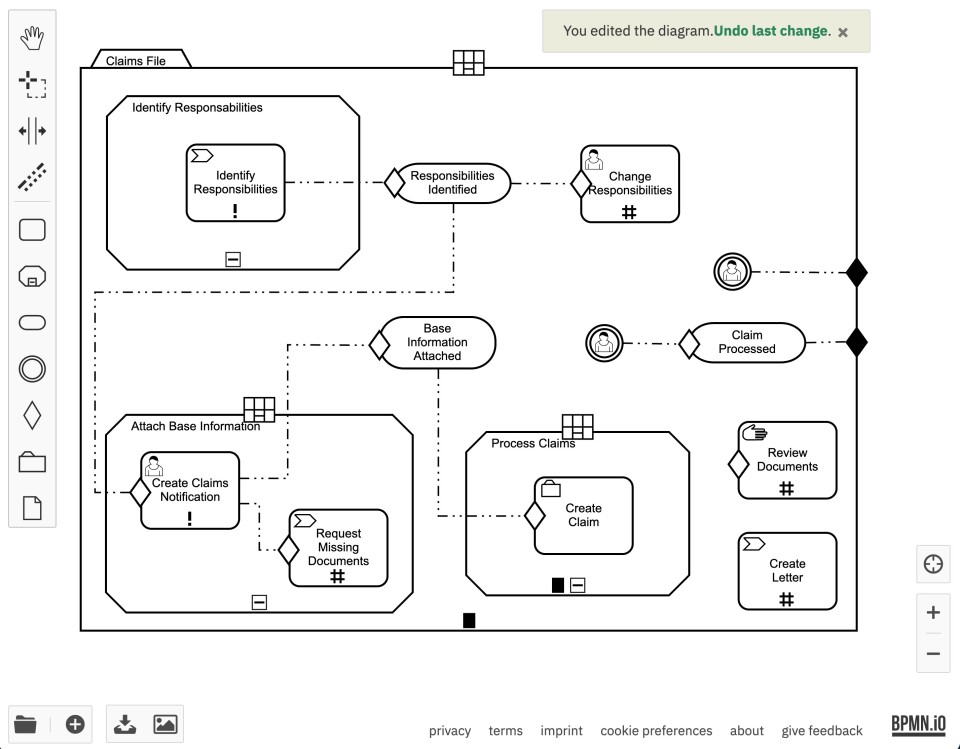 Unter bpmn.io kann man sich eigene Prozessabläufe zusammenstellen. Screenshot: Marcus Schwarze/camunda.de