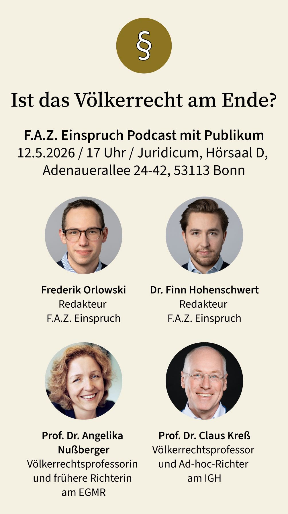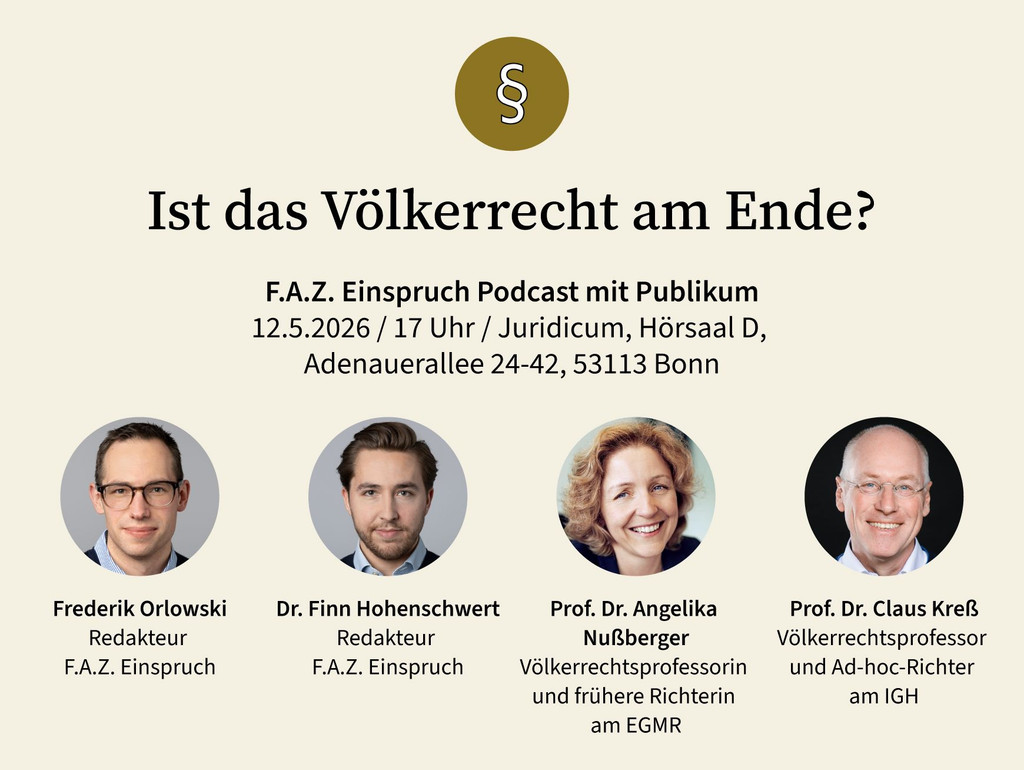 Außerdem starten wir wieder mit unseren Podcasts mit Publikum. Den Auftakt haben Reinhard Müller und Finn Hohenschwert vergangene Woche auf der Juracon Frankfurt gemacht. Die Leitfrage: Ist unser Rechtsstaat fit für die Zukunft? Der nächste Termin steht auch schon fest: Am 10. Mai diskutieren wir in Bonn eine Frage, die derzeit über vielen Konflikten und Krisen steht: Ist das Völkerrecht am Ende?