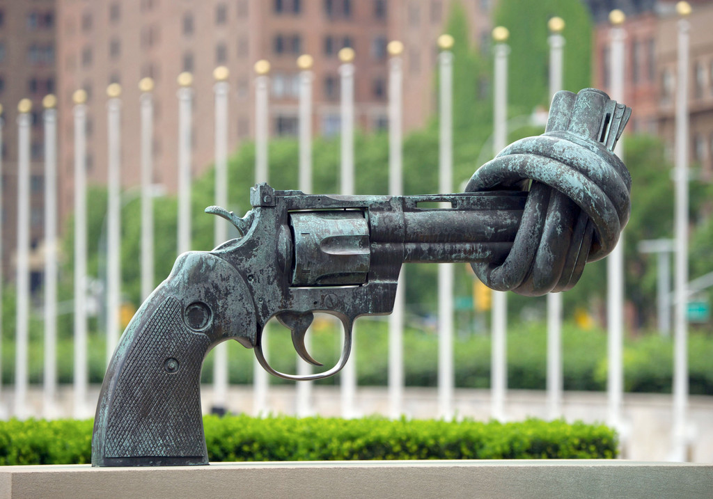 Die Plastik „Non-Violence“, auch bekannt als „The Knotted Gun“, des schwedischen Künstlers Carl Fredrik Reuterswärd vor dem UNO-Hauptquartier in New York, USA picture alliance / dpa