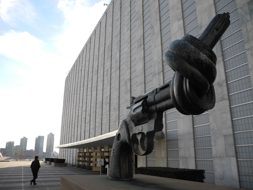 „The Knotted Gun", des schwedischen Künstlers Carl Fredrik Reuterswärd, vor dem UN-Hauptgebäude in New York. dpa