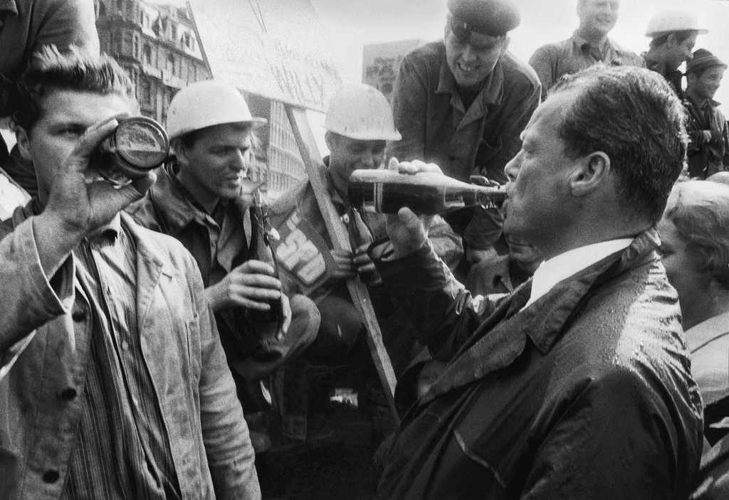 Willy Brandt genießt im Wahlkampf ein Bier in Gesellschaft von Frankfurter U-Bahn-Arbeitern.Lutz Kleinhans
