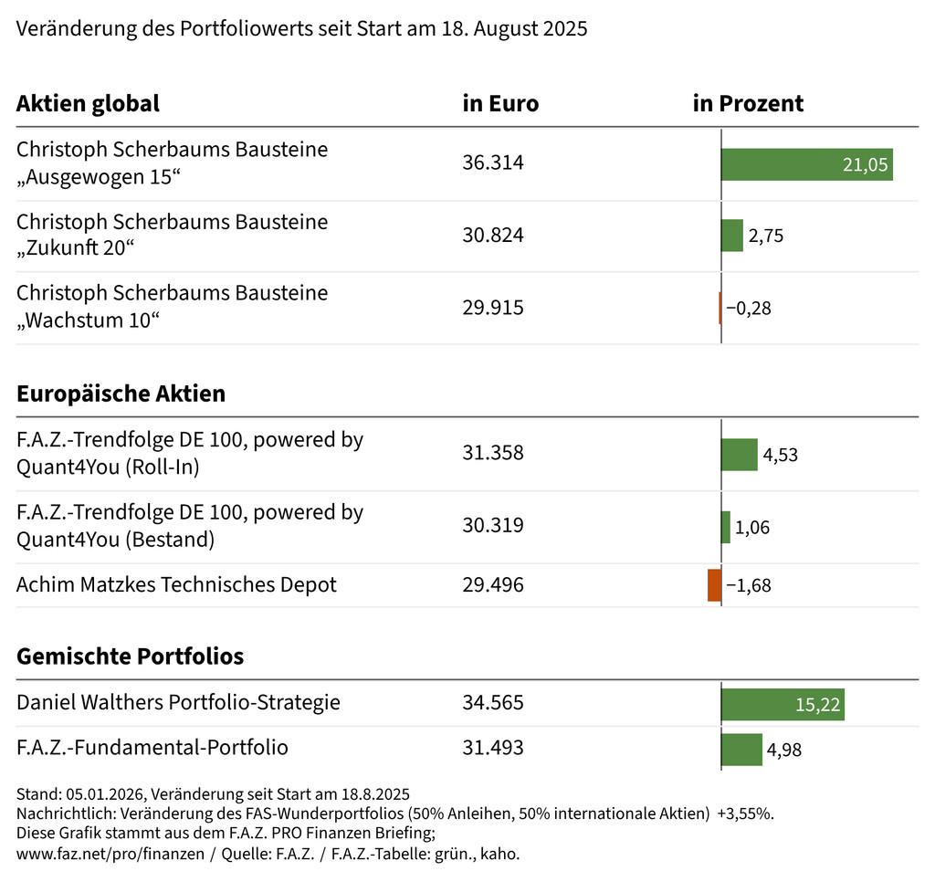 Neues Jahr, neues Börsenglück? Der F.A.Z.-Index auf Allzeithoch, der S&P 500 knapp davor. Gefragt waren in Deutschland vor allem Rüstung und Zykliker. Das eine wegen Venezuela, was doch eher ambivalent ist. Im anderen Fall ist es die „Jetzt muss es doch aufwärtsgehen“-Karte. Wir erinnern uns: Vor genau einem Jahr hatten wir dasselbe schon einmal. War dann nix. Für Vorsicht gibt es Grund genug: Strukturelle Probleme sehen mit besserer Konjunktur nur weniger schlimm aus. (mho.)