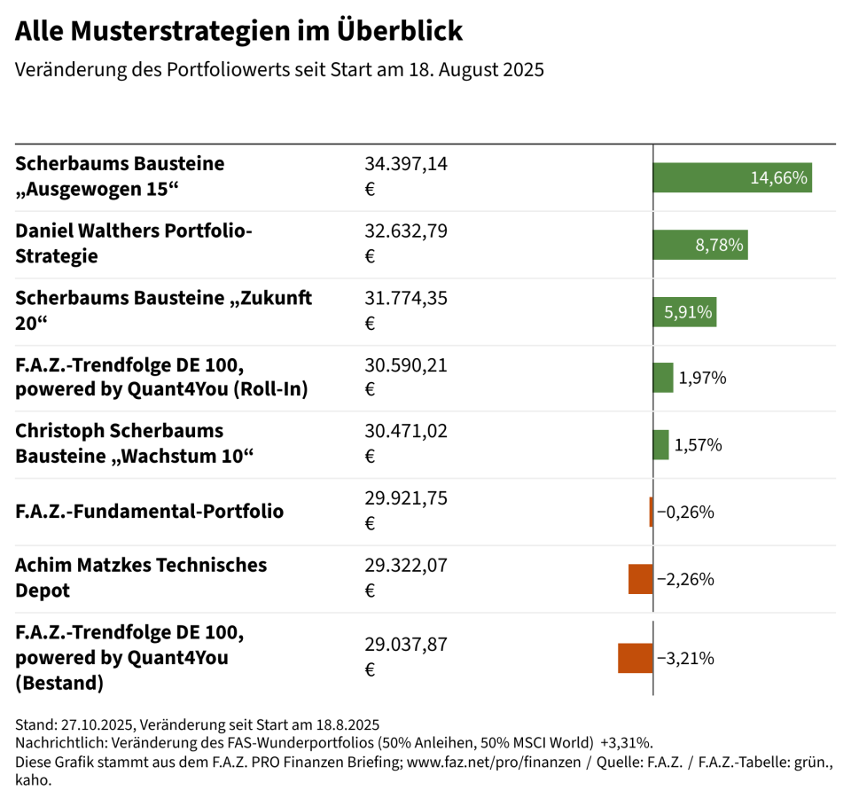 Die Aufstellung des Depots für die F.A.Z.-Musterstrategien hat sich als sehr zufriedenstellend erwiesen: Die Bewegungen haben sich ausgeglichen und der Depotwert ist gleichmäßig angestiegen. Gold als Versicherung im Depot macht deutlich, wie sehr die Fiat-Währungen an Wert verlieren.