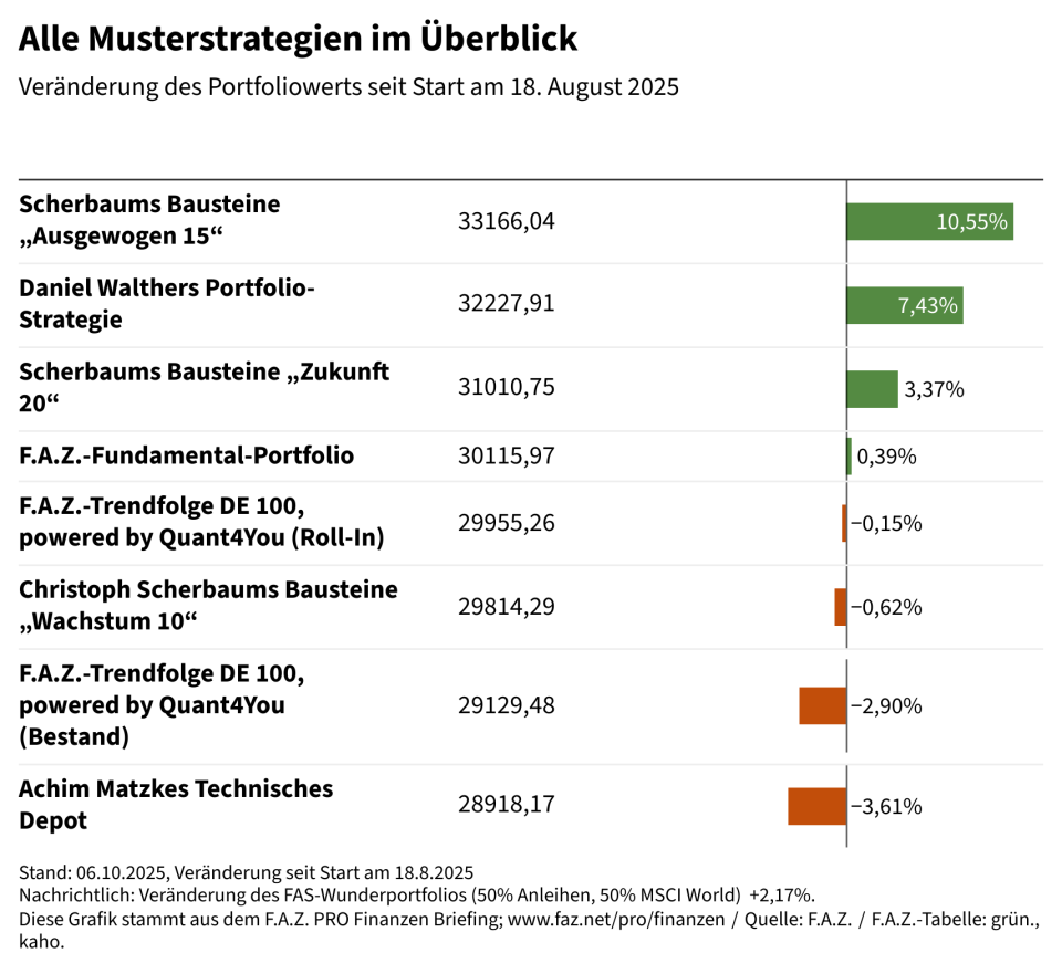 Mit 30.000 Euro sind die Experten in den „F.A.Z.-Musterstrategien“ am 18. August gestartet. In den seitdem vergangenen sieben Wochen hat sich das Feld – wie nicht anders zu erwarten – auseinanderentwickelt: Zwischen knapp 29.000 und mehr als 33.000 Euro betragen aktuell die Gesamtwerte der Portfolios.