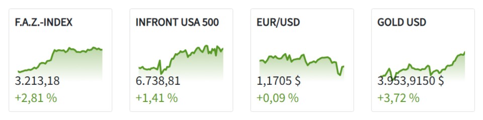 Nach einer in Deutschland und Europa eher wenig dynamischen Zeit macht die Bilanz der vergangenen Tage per saldo mehr Spaß – auch wenn in Europa im Wesentlichen nur der vergangene Mittwoch dazu Anlass gab. Aber es sind immer nur wenige gute Tage, die über Wohl und Wehe von Aktieninvestments entscheiden. Man muss sie halt erwischen. Das ist mit Gold aktuell schon einfacher, das praktisch nur gute Tage zu kennen scheint. Der Euro bleibt hingegen im Bereich von 1,17 Dollar hängen. Zu ausgewogen sind die schlechten Nachrichten auf beiden Seiten des Atlantiks. (mho.)