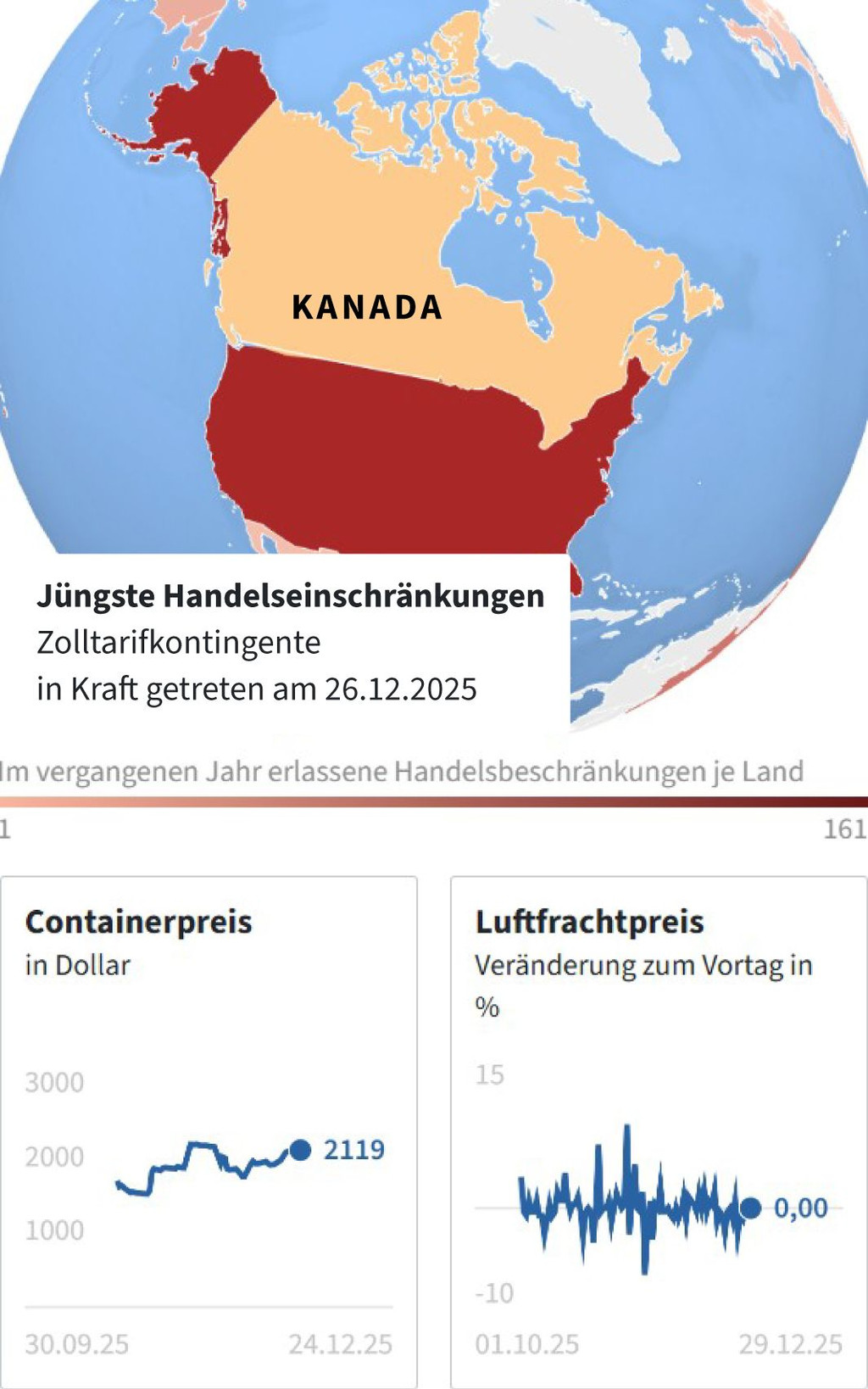 Kanada verringert das Importkontingent für Stahlerzeugnisse aus Ländern, mit denen es ein Freihandelsabkommen geschlossen hat, auf 75 Prozent des Volumens von 2024. Ausnahme bilden Importe aus den USA oder Mexiko. Weitere aktuelle Handelsliberalisierungen und -beschränkungen zeigt unsere interaktive Karte.