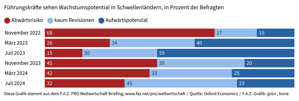 über seine Grenzen hinaus. Die Ausfuhr von Zwischenprodukten Südostasiens nach China hat sich in zehn Jahren verdreifacht. Niedrige Inflationsraten und damit niedrige Zinsen verleihen nun Luft für Investitionen in die überfällige Digitalisierung. Billiglöhne reichen Investoren nicht mehr; es geht um geographische Erreichbarkeit, um politische Sicherheit, Liefertreue, Zugang zu Grundstoffen. Für die Schwellenländer hängt jetzt alles davon ab, wie ihre Regierungen sie aufstellen. (che.)