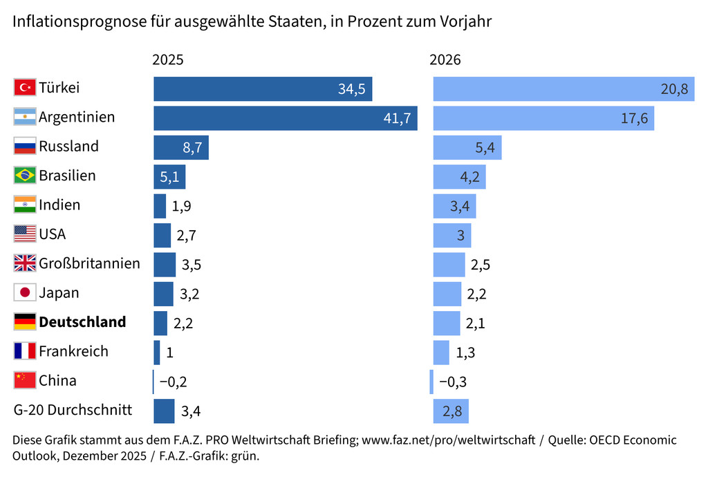 Der doppelte Preisschock von Corona und Ukrainekrieg ist offenbar ausgestanden: Für nahezu alle Industrie- und Schwellenländer erwarten die Ökonomen weiter leicht sinkende Inflationsraten. Das liegt natürlich an den gesunkenen Energiepreisen, aber auch daran, dass das noch Anfang 2025 befürchtete Wettrüsten bei Zöllen, das die Verbraucherpreise treibt, ausgeblieben ist. Damit dürfte das häufige Auf und Ab an Leitzinsen, das mit der Corona-Krise eingesetzt hatte, ausgestanden sein. Mehrere Notenbanken werden sie angesichts der Preisentwicklung und eher schwachen Konjunktur weitgehend stabil halten. Von diesem globalen Trend gibt es jedoch zwei bemerkenswerte Ausnahmen: In China sorgen Wirtschaftskrise und Preiskampf für eine anhaltende Deflation, die die Welt belastet. Und in den USA