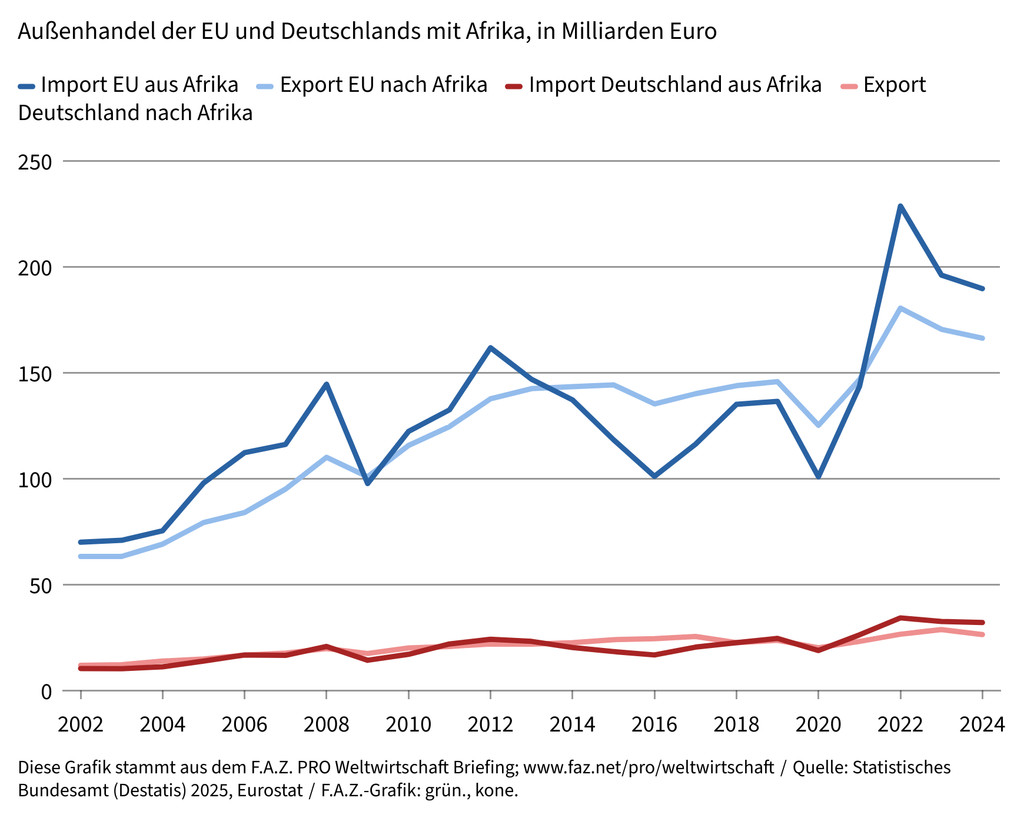 „Europa wird im kommenden Jahrzehnt dringend auf Afrika angewiesen sein“, ist sich Unternehmensberater und Afrikakenner Stefan Liebing sicher. Während traditionelle Handelspartner wie Amerika und China wanken, bietet Afrika wachsende Absatzmärkte und Investitionsmöglichkeiten, etwa in den Bereichen Energie, Agrarwirtschaft, Digitalisierung und verarbeitende Industrie. Und: Viele der 54 Länder bieten Zugang zu strategisch wichtigen Rohstoffen. Diese sollte Deutschland sich sichern, um seine Abhängigkeit von China zu überwinden, plädiert der Bundesverband der Deutschen Industrie (BDI). Viele der 54 Staaten des Kontinents sind politisch relativ stabil, zeigen sich reformbereit und willens, sich zu entwickeln. Beispiele sind Uganda, Ruanda, Äthiopien, die Elfenbeinküste oder Senegal, für