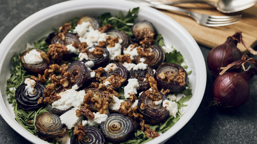 Zwiebeln als Hauptgericht? Ernsthaft? Ja, und zwar mit Ziegenkäse. Die helfen nicht nur den Abwehrkräften, sondern werden im Ofen süß und mild. Und die Walnüsse machen das Gericht extra gesund.